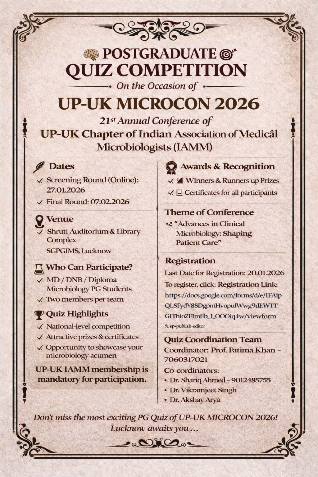 It is a great honour and pleasure for us to cordially invite you to participate in the 21st Annual Conference of UP-UK State Chapter of Indian Association of Medical Microbiologists (IAMM), scheduled to take place from 6th and 7th February 2026 at the Shruti Auditorium and Library Complex, SGPGIMS, Lucknow.